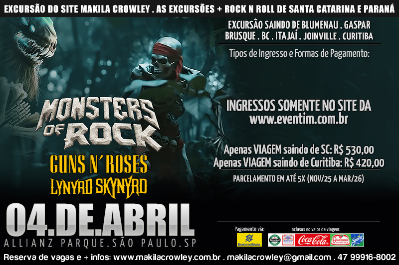 Makila Crowley - Excursões Oficiais de Santa Catarina e Paraná - , HELLFEST, WACKEN, 70000TONS TARJA, METALLICA, ROCK IN RIO, AC/DC, PEARL JAM, ROLLING STONES