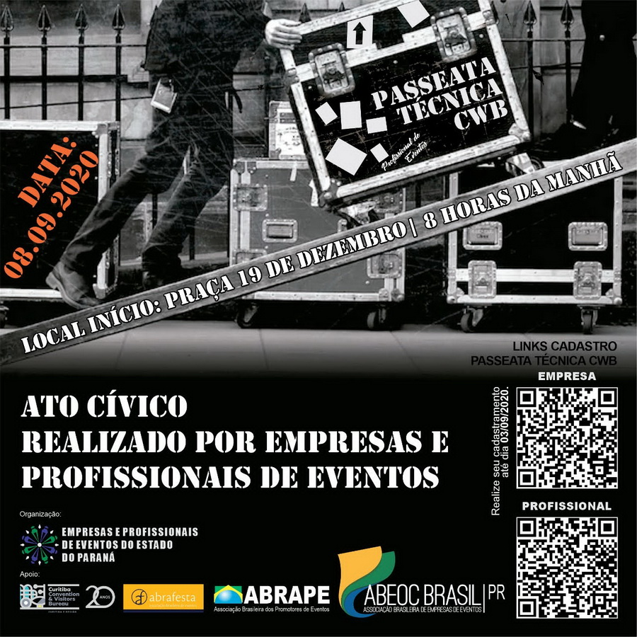 Empresas e profissionais de eventos organizam uma passeata pacífica em Curitiba no próximo dia 08 de setembro, durante o feriado que celebra o dia de Nossa Senhora da Luz dos Pinhais, padroeira de Curitiba. O evento tem início às 10 horas e o percurso será pela Avenida Cândido de Abreu (em frente a Fiep) com caminhada até o Palácio do Governo.