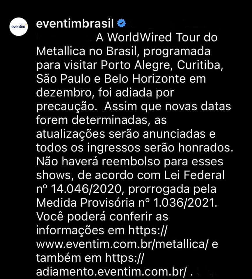 A Eventim soltou um comunicado que a WorldWired Tour do Metallica no Brasil, programada para visitar Porto Alegre, Curitiba, São Paulo e Belo Horizonte em dezembro, foi adiada por precaução (e não cancelada).
