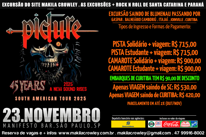 Interessados enviem: tipo de ingresso, nome completo, rg com órgão emissor, cpf, fones res e cel, idade, email e cidade no email abaixo.