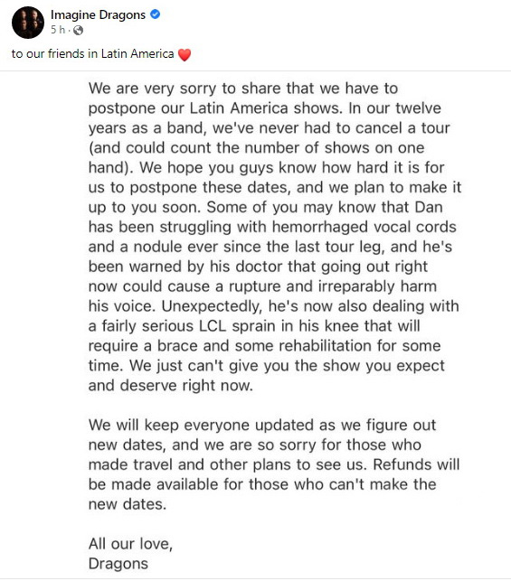 “Lamentamos muito informar que teremos que adiar nossa turnê pela América Latina.