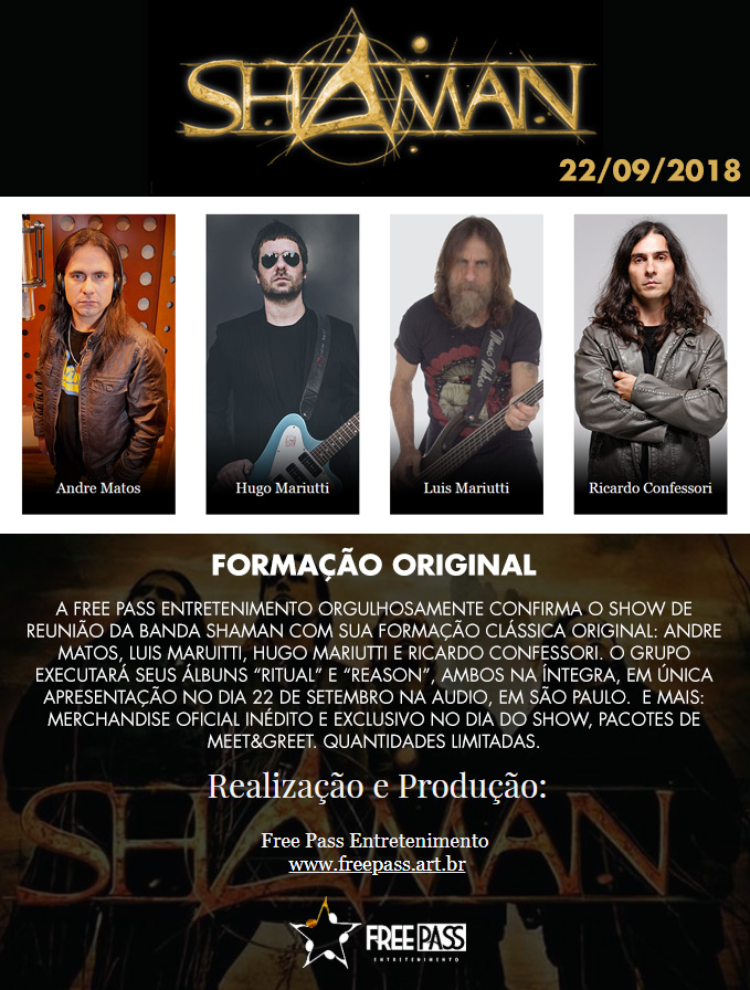 A Free Pass Entretenimento anunciou show de reunião da banda SHAMAN com sua formação clássica original: Andre Matos, Luis Maruitti, Hugo Mariutti e Ricardo Confessori.
